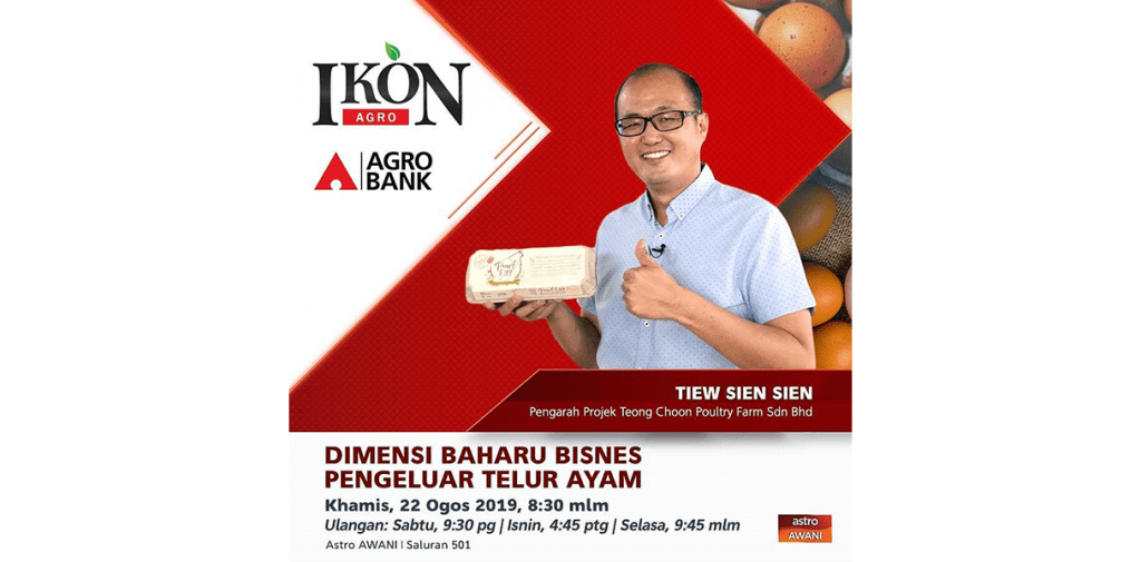 - Ikon Agro Musim ke-2 episod 4 mengisahkan dimensi baharu bisnes pengeluaran telur ayam. Syarikat Teong Choon Poultry Farm Sdn. Bhd. adalah merupakan pengeluar telur ayam berkualiti yang mempunyai ladang ayam telur sehinggalah proses pengedaran telur ayam. Saksikan dengan lebih lanjut bagaimana Agrobank membantu Syarikat Teong Choon Poultry Farm Sdn. Bhd. sehingga berjaya memiliki kilang pengedaran telur ayam dan juga kilang pemprosesan dedak ayam. Jangan lupa temujanji kita jam 8.30 malam setiap hari Khamis di Saluran 501 Astro Awani.