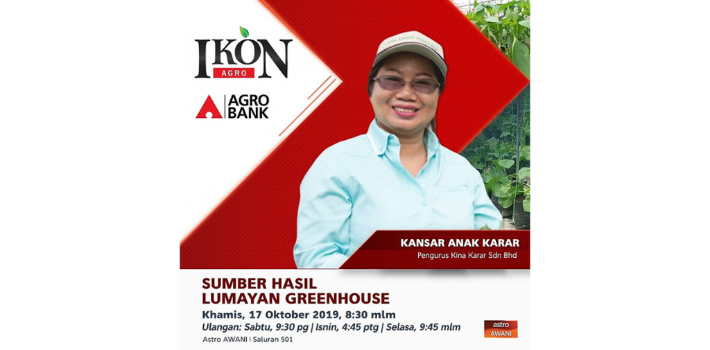 - Ikon Agro Musim ke-2 episod 12 mengisahkan kejayaan syarikat Kina Karar Sdn Bhd yang menyediakan hasil tanaman yang segar dan berkualiti. Ikuti kisah Kansar anak Karar bersama usahanya dalam menghasilkan sumber yang lumayan untuk greenhouse dan bagaimana Agrobank membantu syarikat ini menyediakan hasil tanaman secara fertigasi.