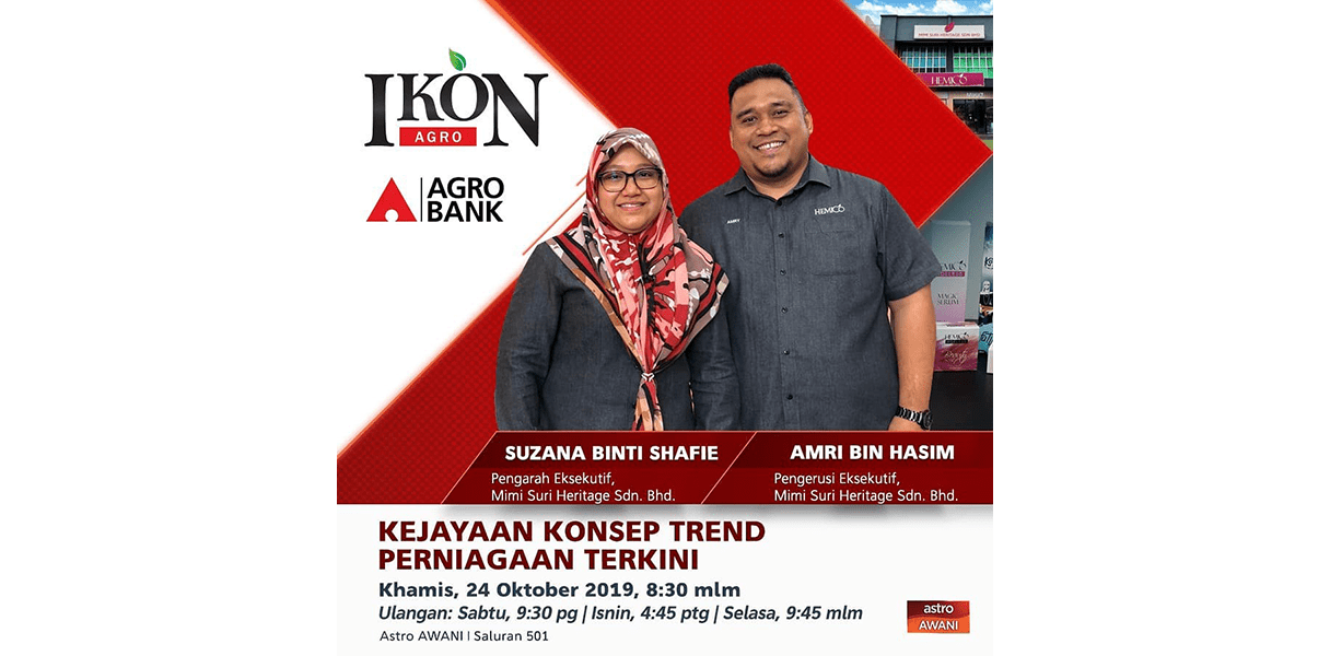 - Ikon Agro Musim ke-2 episod 13 mengisahkan kejayaan syarikat Mimi Suri Heritage Sdn Bhd yang menyediakan konsep perniagaan yang menarik mengikut trend masa kini, sesuai dengan semua lapisan masyarakat dan peringkat umur. Ikuti kisah Suzana Shafie & Amri Hasim bersama usahanya dalam menghasilkan makanan & minuman yang mementingkan kesihatan dan bagaimana Agrobank membantu syarikat ini menyediakan teknologi industri yang memudahkan penghasilan produk.
